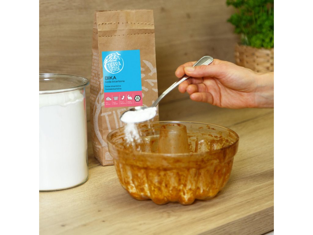 Soda bikarbona se teplem rozkládá na uhličitan sodný, vodu a oxid uhličitý, takže je maximálně ohleduplná k přírodě i našemu zdraví.