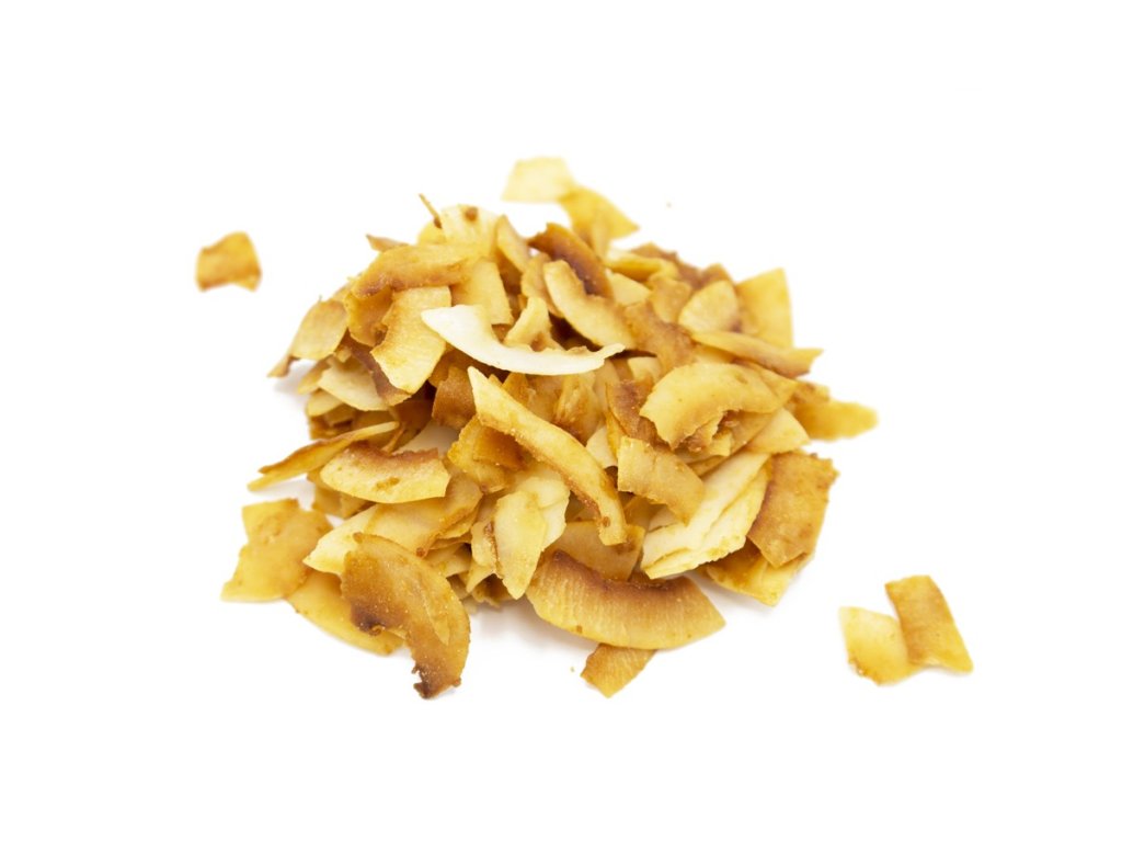 Kokosové chipsy jsou získané z dužiny kokosů sušené na slunci, které se po usušení říká “kopra”. Následně jsou lehce pečené a ochucené kokosovým nektarem se špetkou mořské soli. Výsledkem je neodolatelná sladkoslaná chuť karamelu. Dužina kokosu je plná rostlinných tuků a vlákniny, neobsahuje lepek ani laktózu.