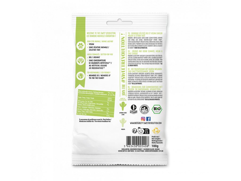 Složení: Glukózový sirup*, třtinový cukr*, želírující látka (pektiny), okyselující látky (kyselina citronová, kyselina mléčná), barvicí koncentráty* (dýňové*, jablečné*, spirulinové*), přírodní melounové aroma, přírodní limetkové aroma. *z kontrolovaného ekologického zemědělství