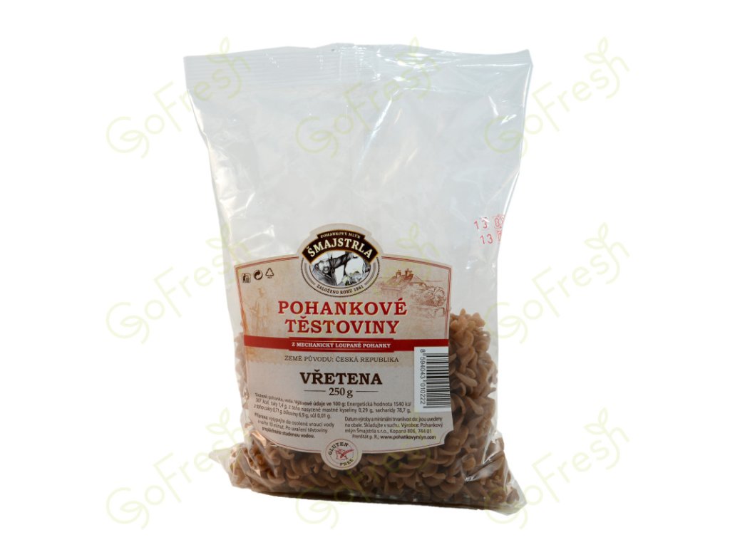Těstoviny jsou vyrobeny z pohankové mouky. Jsou bezvaječné, bezlepkové a bez přídavků jiných surovin. Jsou chutnou alternativou pšeničných těstovin a vynikající variantovou zdravého stravování. Vhodné pro diabetiky. Složení: pohanková mouka a voda Použití: Vřetena se využívají jako příloha, na zapékání, s tvarohem a ovocem. Protože je to potravina bezlepková, je nutno přidat při vaření o trochu více vody a kapku olivového oleje. Po uvaření ve vodě nechat chvíli "dojít".